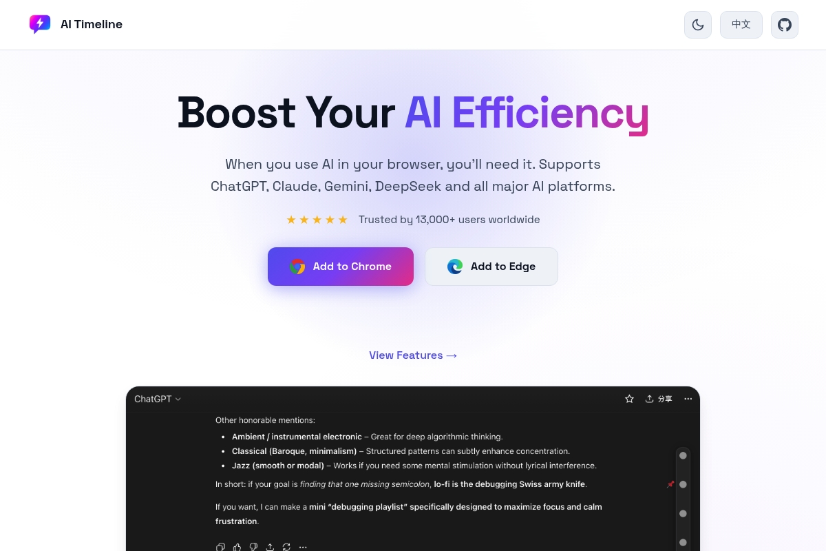 AI Timeline是一款专为人工智能从业者和爱好者设计的效率工具平台,旨在帮助用户更好地管理和组织AI相关的工作内容。该产品通过创新的时间线功能和智能书签系统,让用户能够系统性地追踪AI领域的发展动态、整理学习资源、管理项目进度,从而大幅提升工作效率。